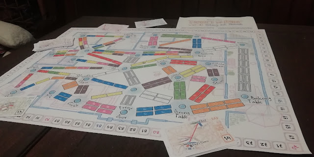 I did, however, get the opportunity to make myself a copy of the pandemic-themed print-and-play release of the Ticket to Ride: Stay at Home, expansion, in which up to four family members attempt to complete routes around their own house (the idea of a game that is fundamentally about travel being subverted like this makes me giggle), and after low-level badgering over a period of weeks Mrs. Owl eventually agreed to play it with me.
