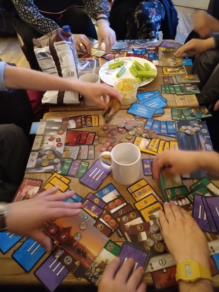 By this point in the night numbers were still going up, so we split into two groups, with eight people indulging in a couple of games of Captain Sonar while I led a five-player game of Paperback, which I always sell to people as a mixture between Scrabble and Dominion. As usual for a five-player game, this one took a while, but it rolled along at a pretty good rate with a whole host of good words being created, and when we finished I was a couple of points short of winning, with Luisa's high-value letters outweighing my solid card-drawing deck.
